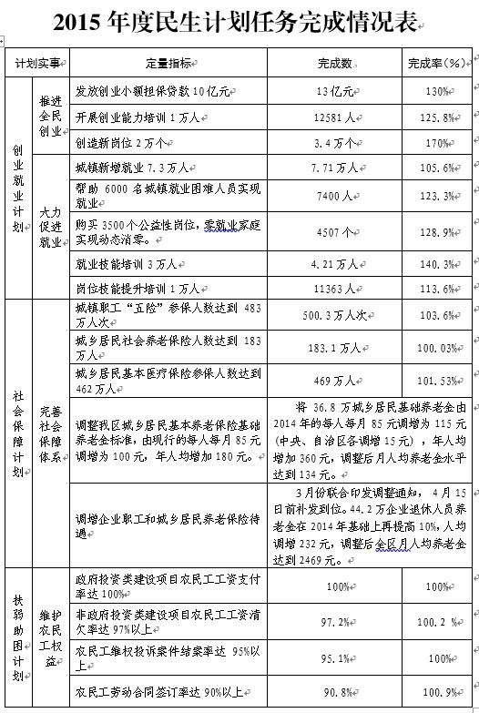 刚刚过去的2015年,在自治区党委的正确领导下,在自治区人大、政协的监督和支持下,自治区政府及各部门深入贯彻落实党的十八大和十八届三中、四中、五中全会精神,坚持富民为先、民生为重,把民生工作作为一切工作的出发点和落脚点,对涉及群众现实利益的突出问题,尽心解决、尽责落实,10项民生计划为民办30件实事列入的92项计划指标全面完成,涵盖扶贫、城乡安居、残疾人保障、创业就业、学生营养改善等方方面面。